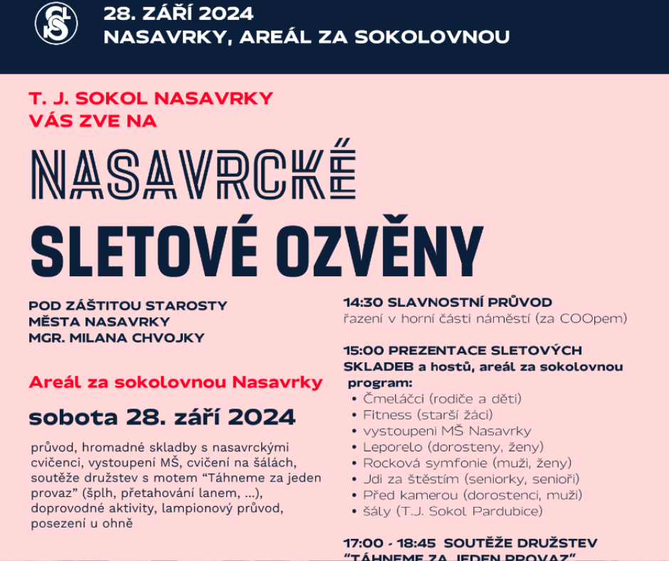V sobotu, dne 28. 9. 2024 se v Nasavrkách konají Sletové ozvěny. Akce, na které v našem kraji máte naposledy možnost shlédnout hromadné skladby, které se představily na letošním XVII. Všesokolském sletu. Naše jednota vysílá na tuto akci přes 40 svých cvičenců. Slavnostní průvod začíná ve 14:30 a od 15 hodin bude zahájeno vystoupení hromadných...